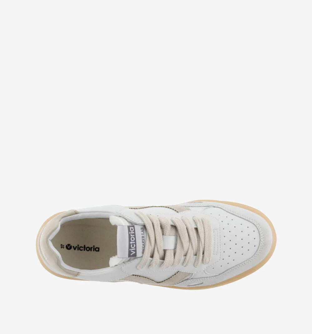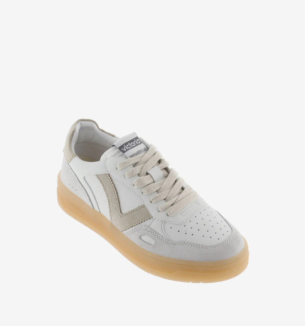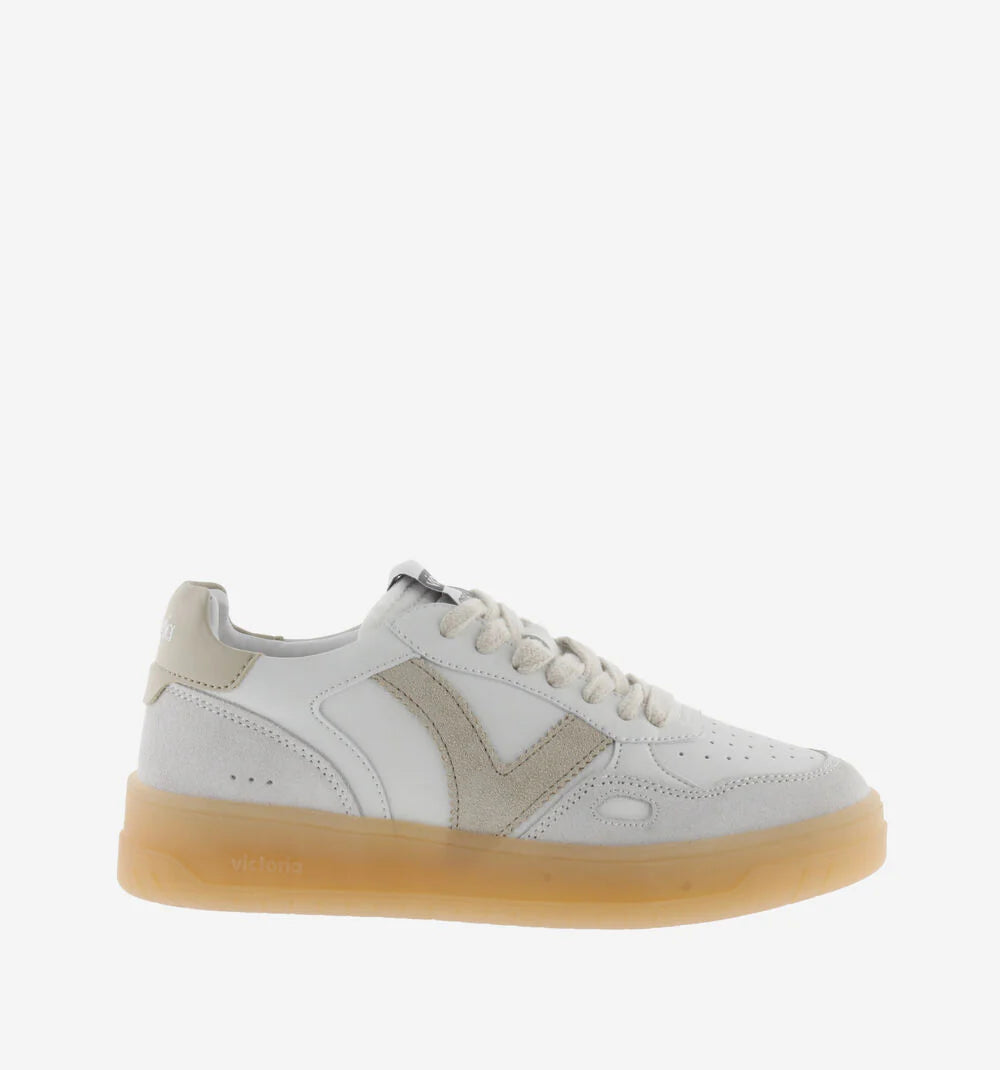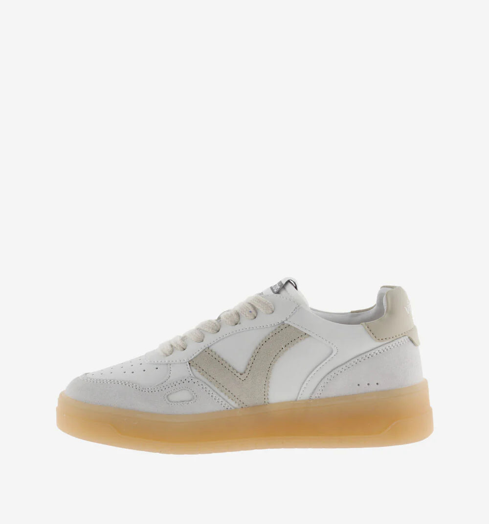 SEUL unisex sports trainers made in leather effect material and split leather pieces. Coloured details on the side V, back piece and laces. Translucent 3 cm caramel-coloured sole, which adds an elegant and different touch. They also include an additional padded insole for improved comfort.