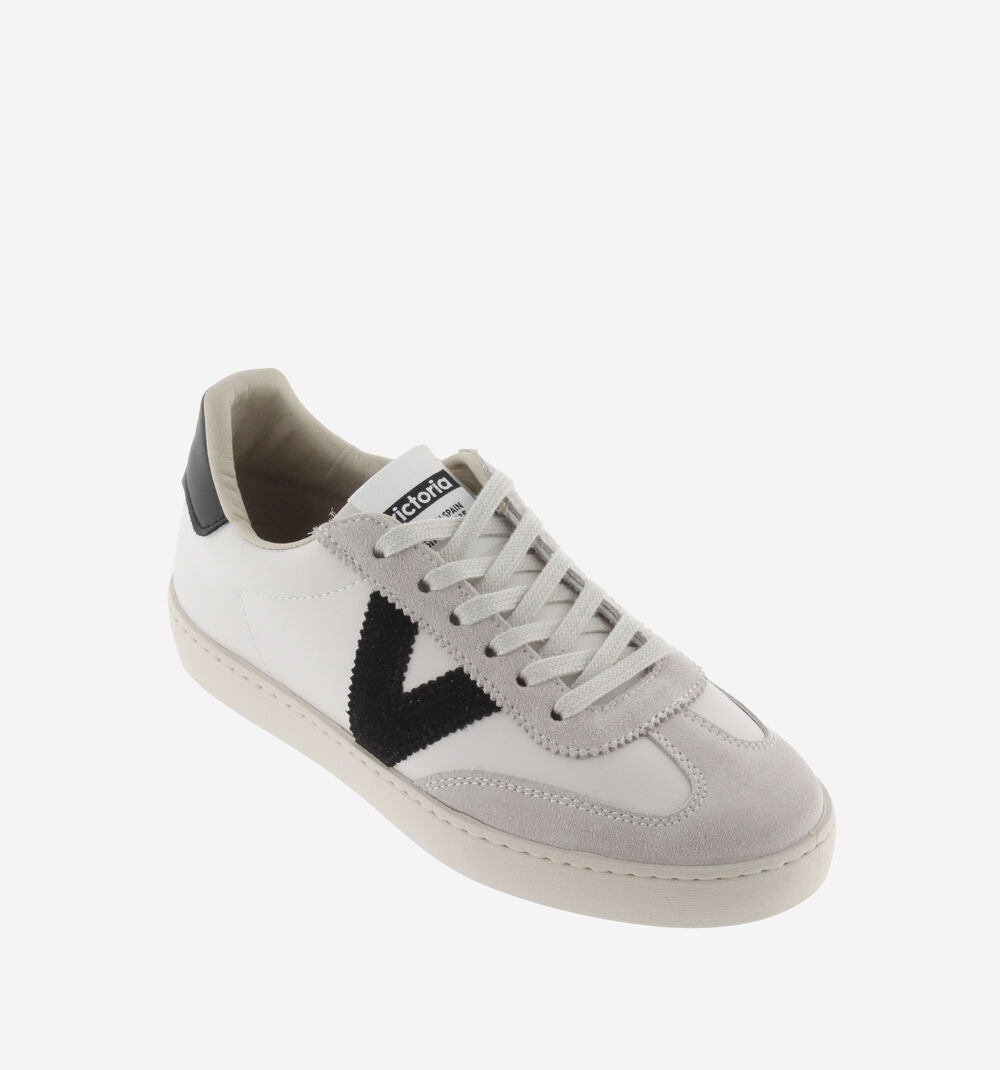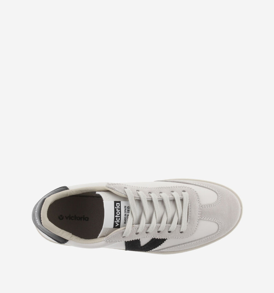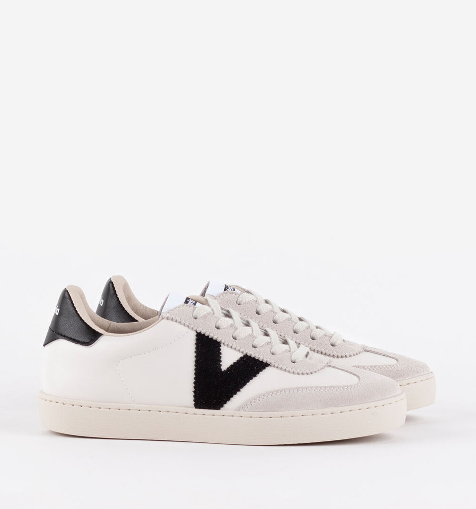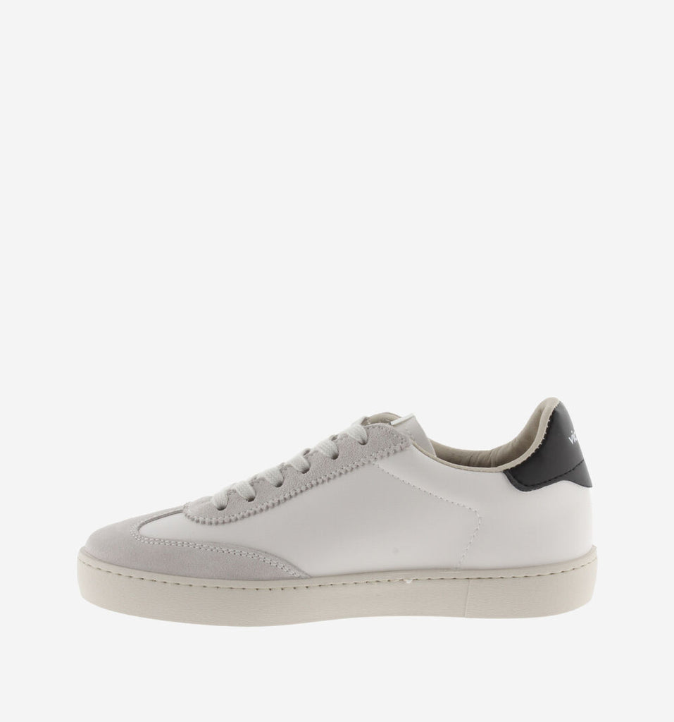 White trainers made in Spain in faux leather and split leather panels. Colour details on the V on the side and back and new cyclist cut at the toe, for added style. Light brown sole made with vegetable oils rather than mineral oils, true to our commitment to the environment. Every pair of shoes also features a more ergonomic insole made from recycled materials.