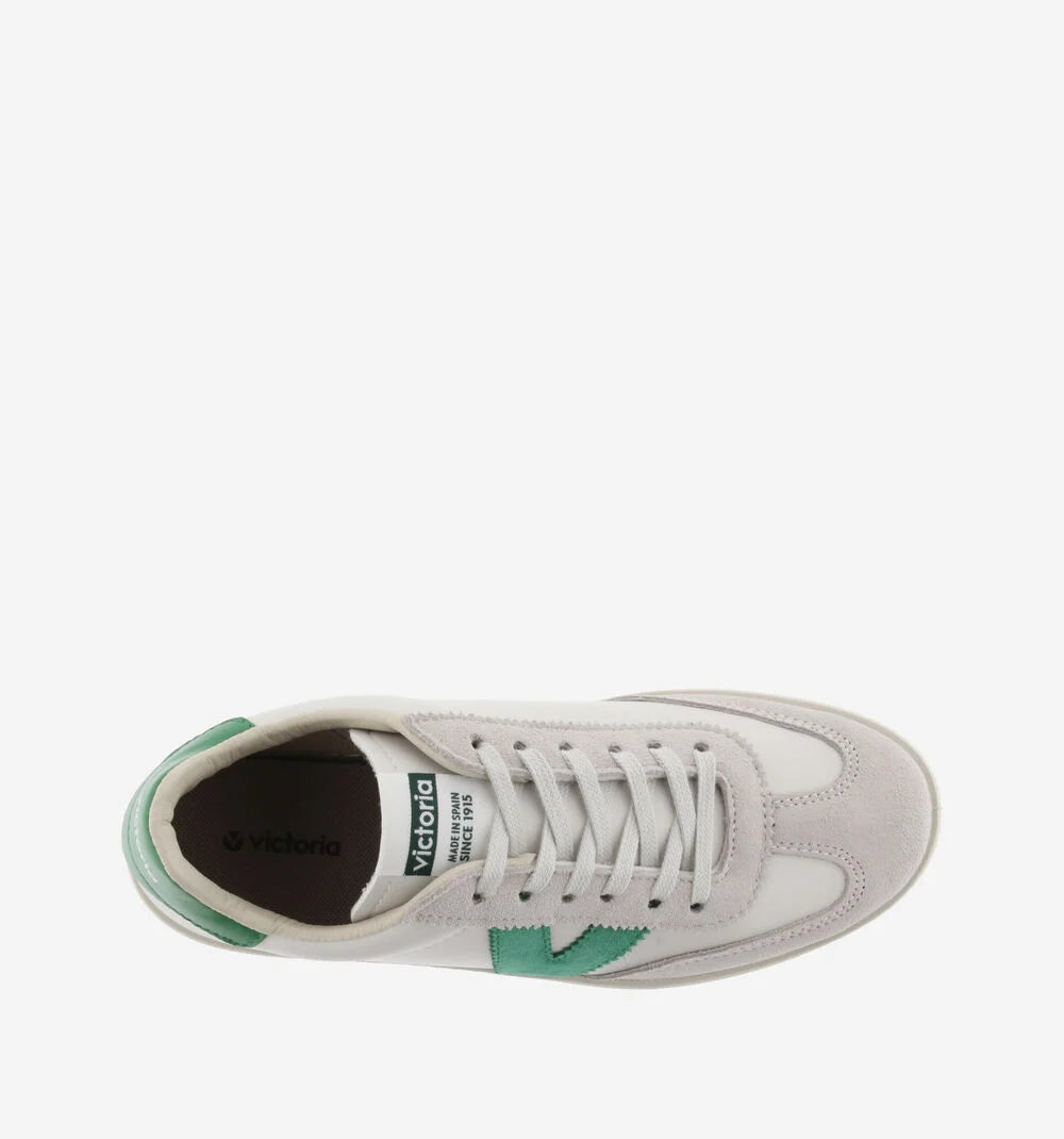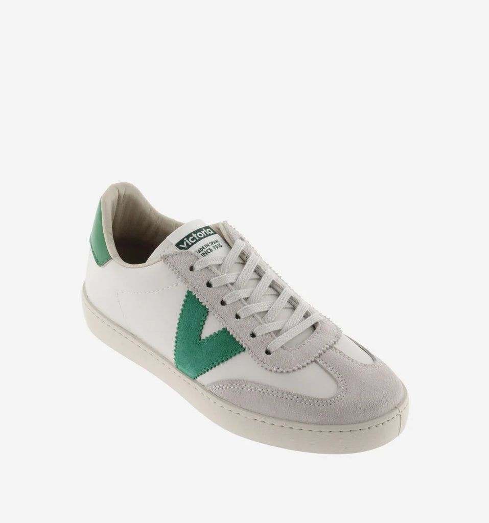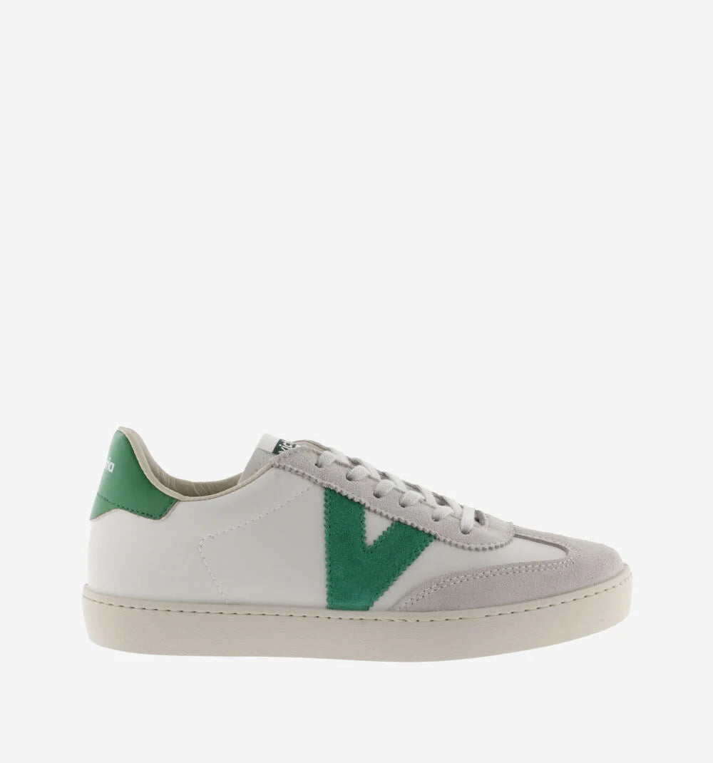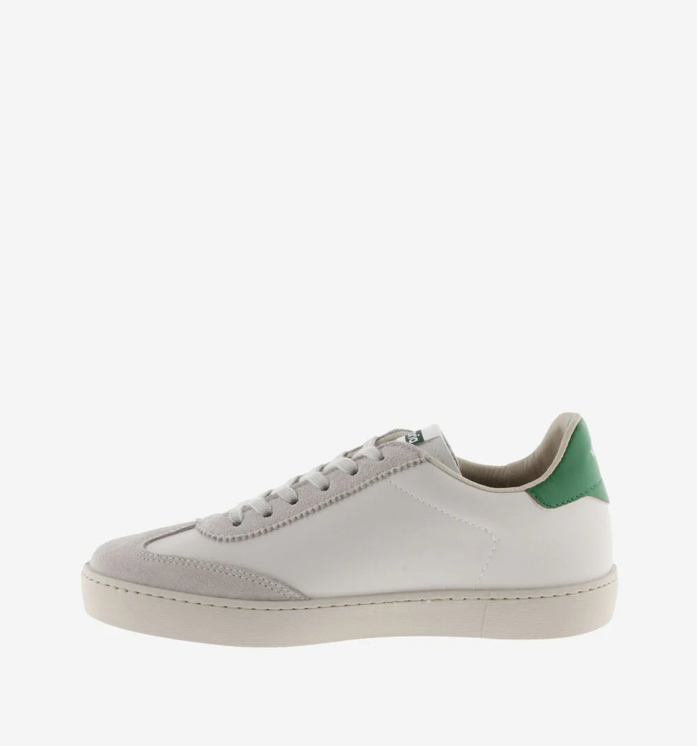 White trainers made in Spain in faux leather and split leather panels. Colour details on the V on the side and back and new cyclist cut at the toe, for added style. Light brown sole made with vegetable oils rather than mineral oils, true to our commitment to the environment. Every pair of shoes also features a more ergonomic insole made from recycled materials.